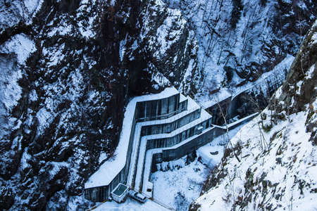 Top view from Vidraru dam on Arges river in Transylvania, Romania. Fagaras ridge in the Carpathian mountains. Hydro electric power station