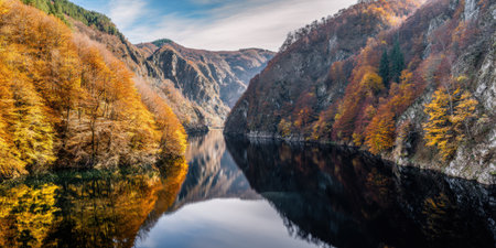 Winding river reflecting vibrant fall foliage on steep canyon walls and distant rugged mountains under a clear sky, showcasing the tranquil beauty of nature during autumn season