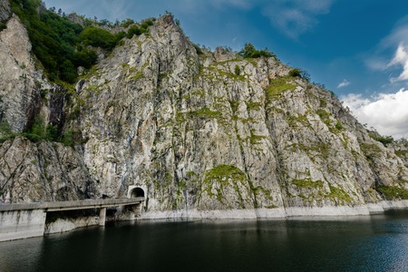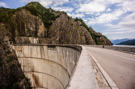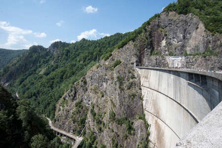 Vidraru artificial lake and dam on Arges river in Transylvania, Romania. Highway in the Carpathian mountains, Fagaras ridge. Hydro electric power station