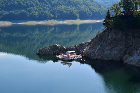 A small pleasure boat crosses the Vidraru lake (hydropower construction) in the Carpathian Mountains, Transfagarasan (Romania)