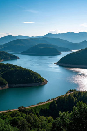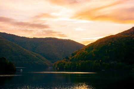 Tara National park ,lake Zaovine during sunset. Nature outdoors travel destination, Tara mountain, Serbia