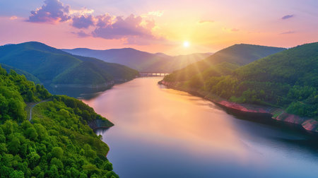 sunset reflecting off a hydroelectric dams reservoir, created with generative ai