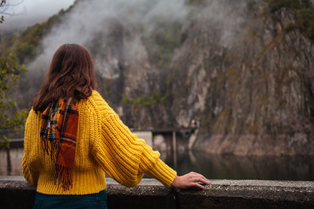 woman looks at mountains, beautiful landscape, cloudy rainy weather, bad. Loneliness, travel, human and nature. Alone with myself. fog