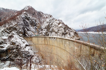 Dam and reservoir on Lake Vidraru. Hydropower construction, waterworks Dam Vidrau on Transfagarash highway in Romania.