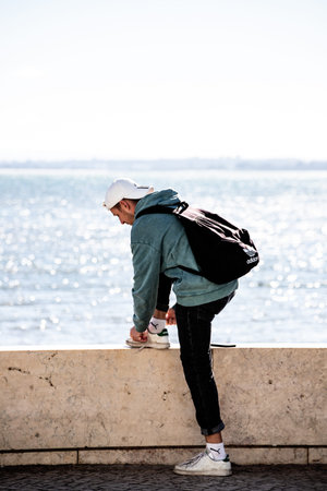 A young sports guy with a backpack stands in the distance on a precipice over the sea