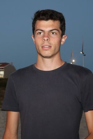 a handsome young man looking away from camera in winter evening. his face is lit with evening light. some bushes and a clear blue sky in the background. he is wearing a sports jacket