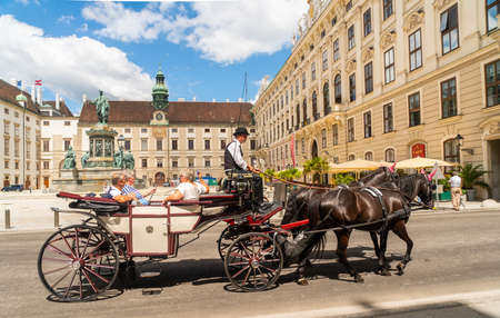 Vienna, Austria - June 24th 2020 - Tourists getting a horse carriage ride through the Hofburg Castle, the house of Sisi, during Corona time on a sunny day