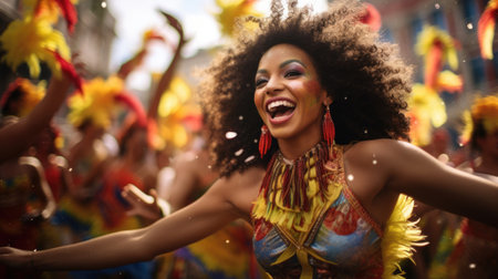 Generative AI Image of American Woman Samba Dancer with Headdress Smiling in City Street