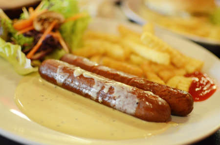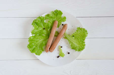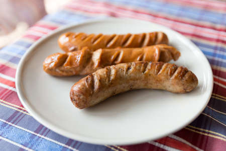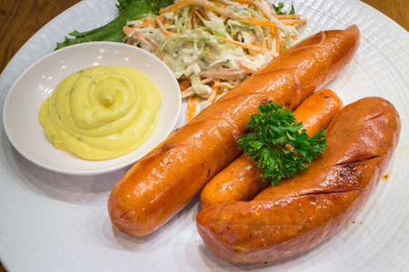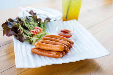 Healthy Three fried sausages with salad in a white dish on wood table background for ready to serve.