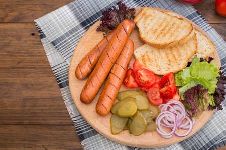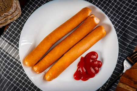 fried sausage and sausages. Grilled sausages with sauce ketchup on a wooden table.