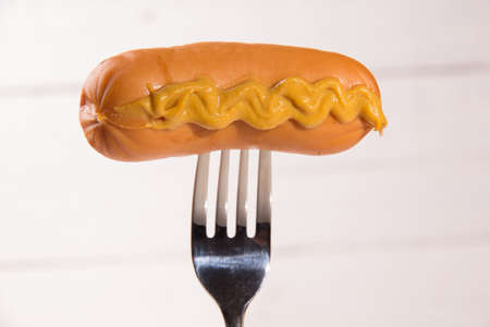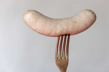 French uncooked hot dog sausages and a fork puncturing them on white plate and white background.