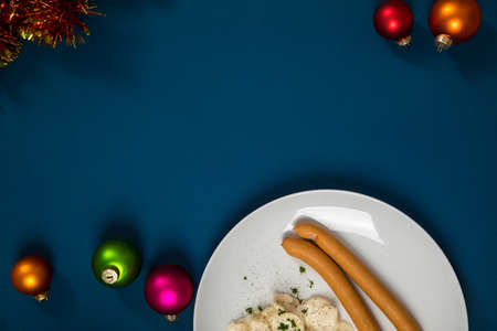 Wiener sausages and potato salad as typical German Christmas eve holiday dinner with tree decoration and ornaments