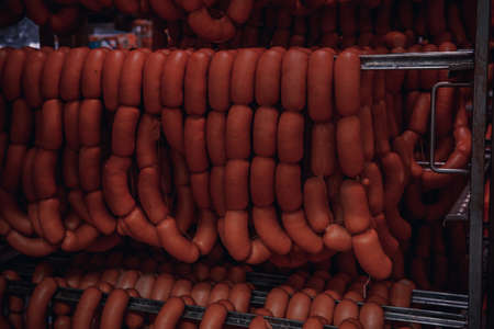 Sausages and sausage close-up. Meat products in the store. The production of sausages. Meat products in the window of a grocery store.