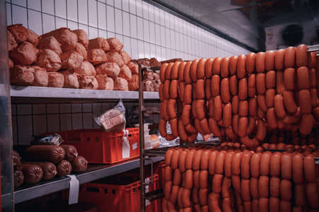 Cold and fresh smoked meat in the market. Butcher shops meat counter. Saling sausages and hum.