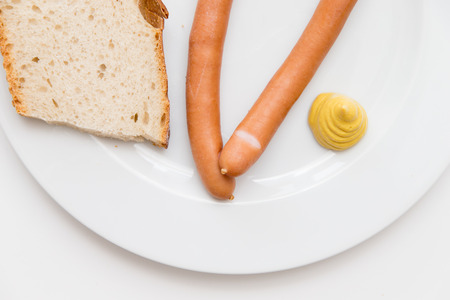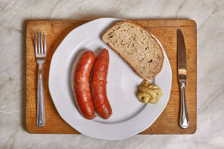 POV at the plate with two traditional German long sausages and potatoes salad with vegetables and mustard plate