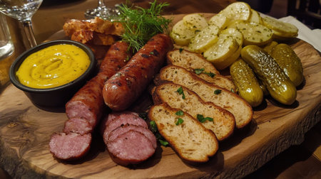 Indulge in a vibrant charcuterie board featuring delicious sausages, pickles, and bread. Perfect for sharing at any gourmet dining experience.