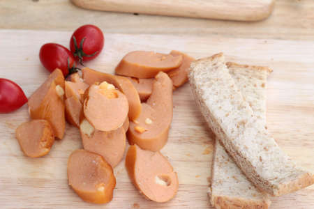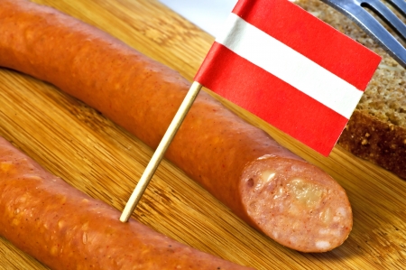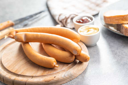 Smoked frankfurter sausages on cutting board on kitchen table.