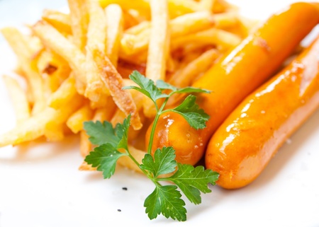 Fried fries potatoes with grilled meat German sausage served in old restaurant in Germany cloaw up