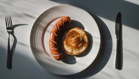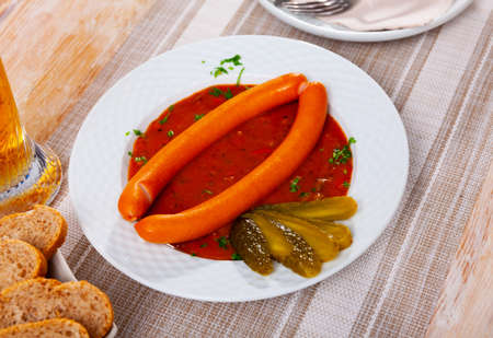 traditional German sausage on dish on red and blue tablecloth in restaurant