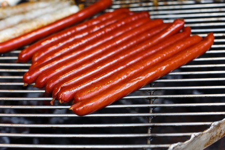 Sausage party. Barbecue large grill outdoors. Cookout bbq food. Big roasted pork and beef german sausages, white polish kielbasa. Meat grilled snack. Street food, fast food. Tasty appetizer, sausages.
