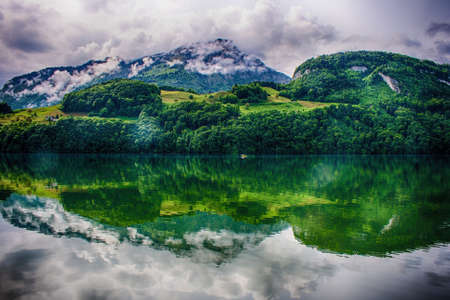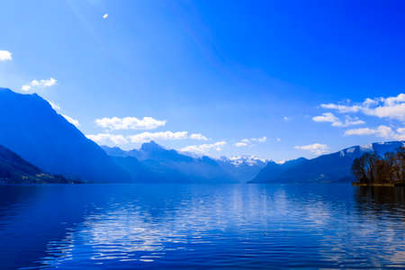 Alps mountain background. Swiss Alps mountain on sunny day. Mountain under clouds in blue sky. Blue nature background. Blue lake with sky near blue mountain.