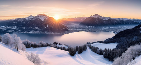 Majestic winter landscape featuring a serene lake surrounded by snow-covered mountains in Switzerland