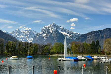 Boats moored on the Walensee lake on a sunny spring day. View of the snow-capped Alps. Village of Weesen, See-Gaster, canton of St. Gallen, Switzerland.