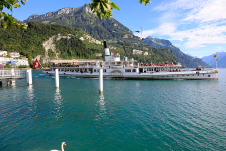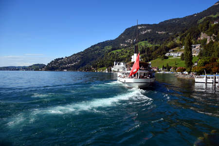 Vitznau, Switzerland 29.09.2019: A steamboat with Swiss flag on the back and with tourist is leaving the port