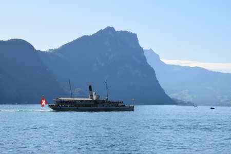 Vitznau, Switzerland 29.09.2019: A steamboat with Swiss flag on the back is crossing Lake Lucerne