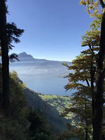 Looking over fields, farms and Lake Lucerne in Switzerland