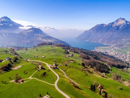 Aerial view on Walensee (Lake Walen) in Weesen, nearby Beltis, Amden. Canton St. Galen, Glarus, Switzerland.