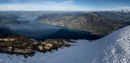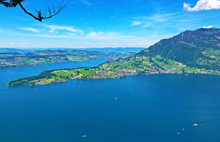 View of Lake Lucerne or Vierwaldstaetersee and Swiss Alps in the background from Vitznauerstock peak - Canton of Lucerne, Switzerland