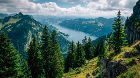 Alps mountain range with Mount Pilatus Lake Lucerne verdant alpine meadows in bloom and Switzerland are all visible in the panorama