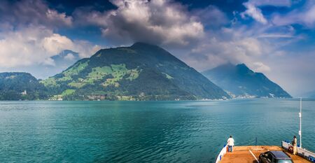 panoramic view into the mountains on a boat cruise on lake lucerne end of spring switzerland