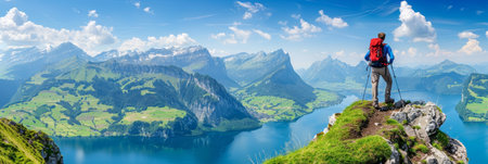 Adventurous Hiker Conquers Majestic Peak, Gazing Upon a Breathtaking Valley and Serene Lake