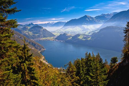 View from Rigi mountain on Swiss Alps, Lake Lucerne and Pilatus mountains panorama vacation in Switzerland