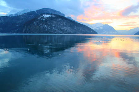 Sunrise around the lake uri - lucerne with alps and alpine glow, lake promenade, Central Switzerland