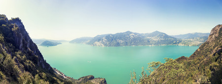 panoramic view into the mountains on a boat cruise on lake lucerne end of spring switzerland