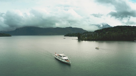 LUCERNE, SWITZERLAND - APRIL 27, 2019. Aerial shot of MS Titlis ship moving on the lake, Alpine scenery