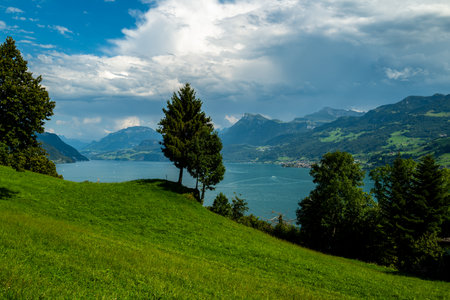 Cloudy sky over a hill on the lake Lucerne in Switzerland. You can see grassy and wooded areas there.