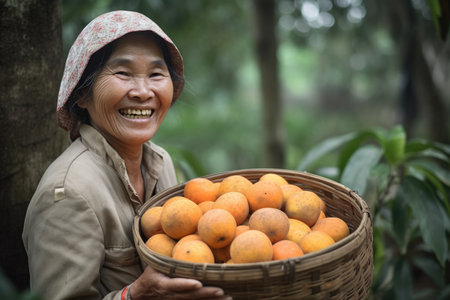 Woman holding a basket full of freshly picked Santol fruits with a smile on her face in a farm setting