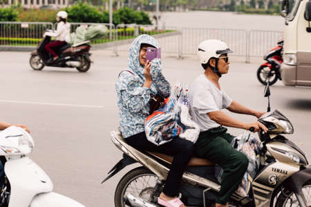 Woman take a while sitting on moving motorcycle on the street of Hanoi, Vietnam.
