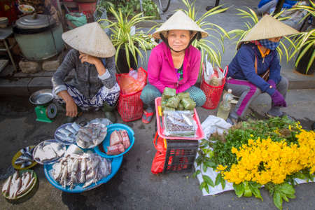 Hoi An, Vietnam - October 30, 2018: People in local street fresh food market of Hoi An, Vietnam.