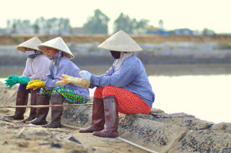 NINH HOA, VIETNAM - MARCH 2, 2012: Vietnamese women salt workers are relaxing after working hard to collect salt from the extract fields to the storage fields