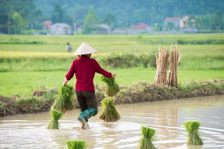 Vietnamese woman wearing purple long arm t-shirt conical hat siting and waiting on the land for tourist at Trang An Grottoes in Ninh Binh, Vietnam.