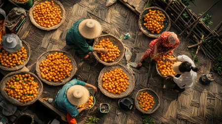 Top view of Asian women are harvesting oranges in the basket at the market.