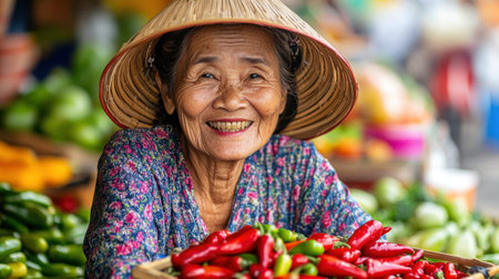 A cheerful elderly woman wearing a straw hat smiles while showcasing a basket filled with bright red chili peppers at a lively outdoor market, celebrating local culture.