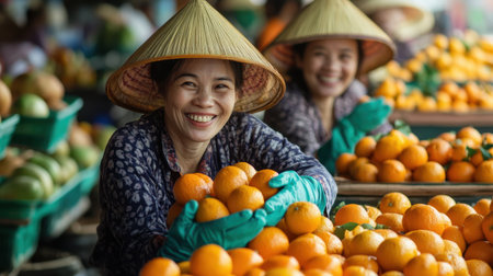 Smiling workers in hats and gloves arrange fresh oranges and other fruits in the market, displaying colorful, vibrant produce in a lively and inviting setting.