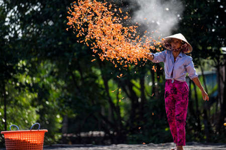 An Giang, Vietnam - Dec 6, 2016: Caught fishes with Vietnamese women working at Tac Cau fishing port at dawn, Me Kong delta province of Kien Giang, south of Vietnam