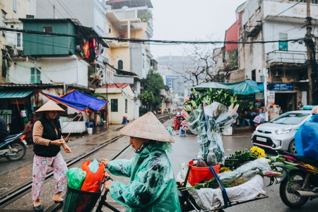 The street vendor with bike loaded of flowers in old town street in Hanoi, old houses and street activites on background